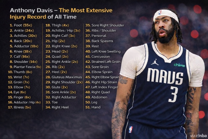 天妒英才!浓眉生涯伤病汇总:总计51类伤情!足部伤势反复55次!